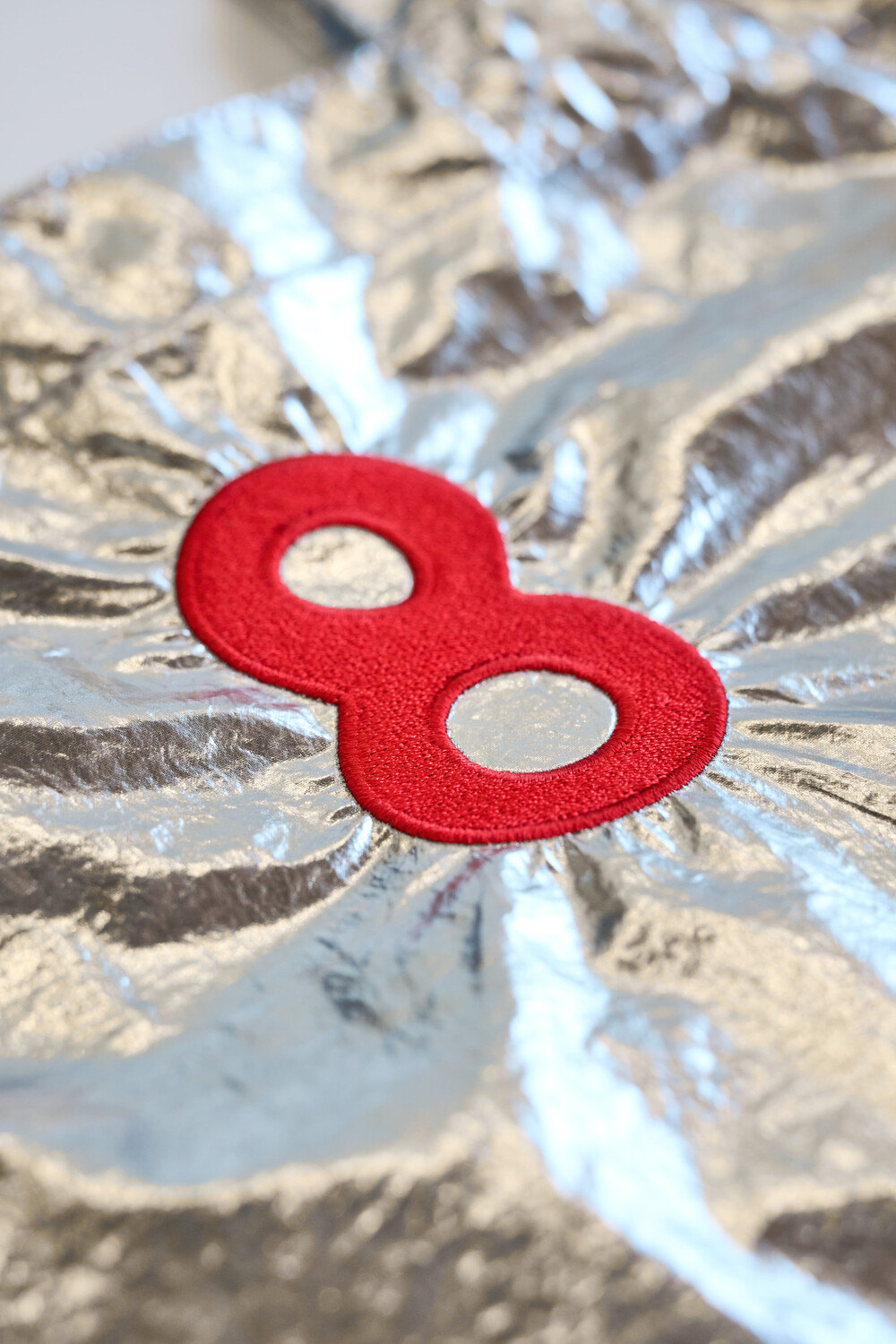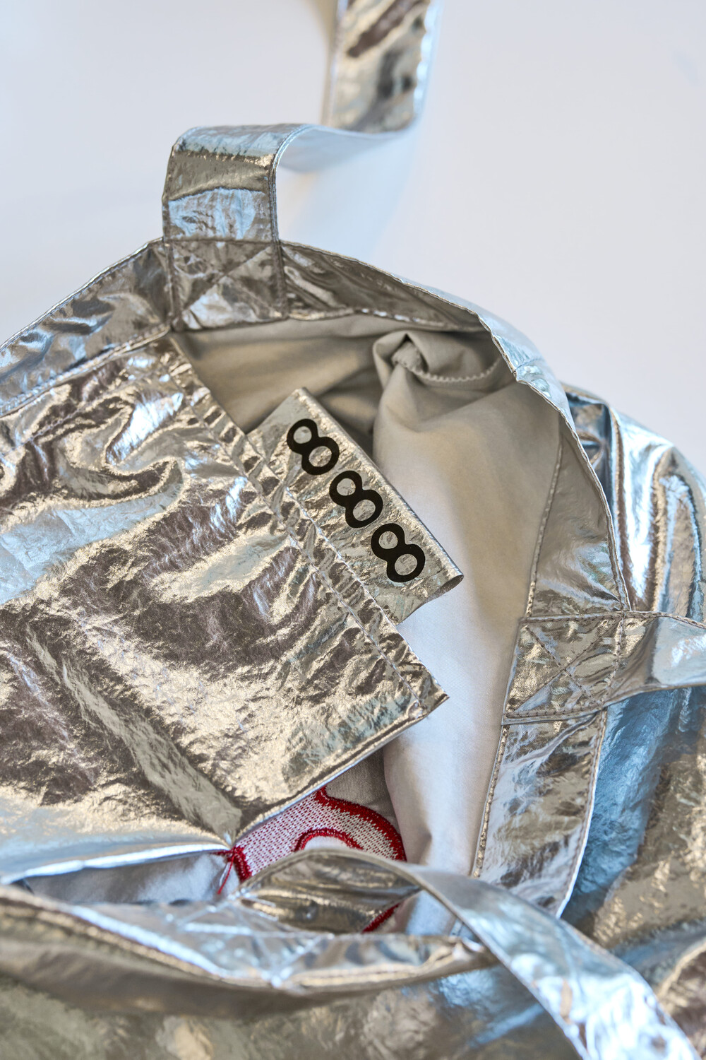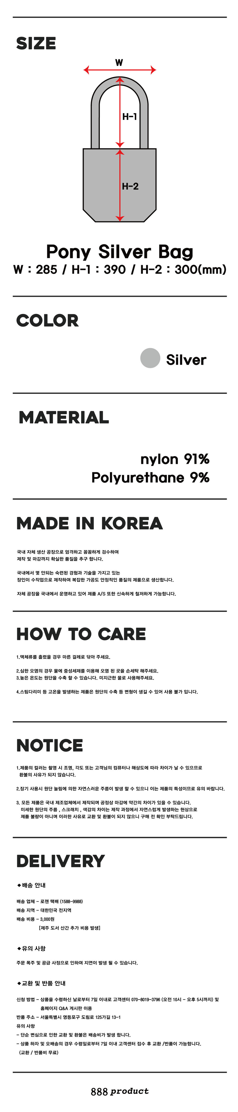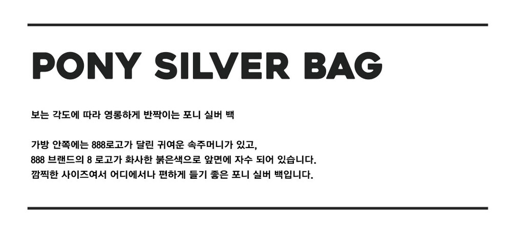 보는 각도에 따라 영롱하게 반짝이는 포니 실버 백 . 가방 안쪽에는 888로고가 달린 귀여운 속주머니가 있고, 888 브랜드의 8 로고가 화사한 붉은색으로 앞면에 자수 되어 있습니다. 깜찍한 사이즈여서 어디에서나 편하게 들기 좋은 포니 실버 백입니다.